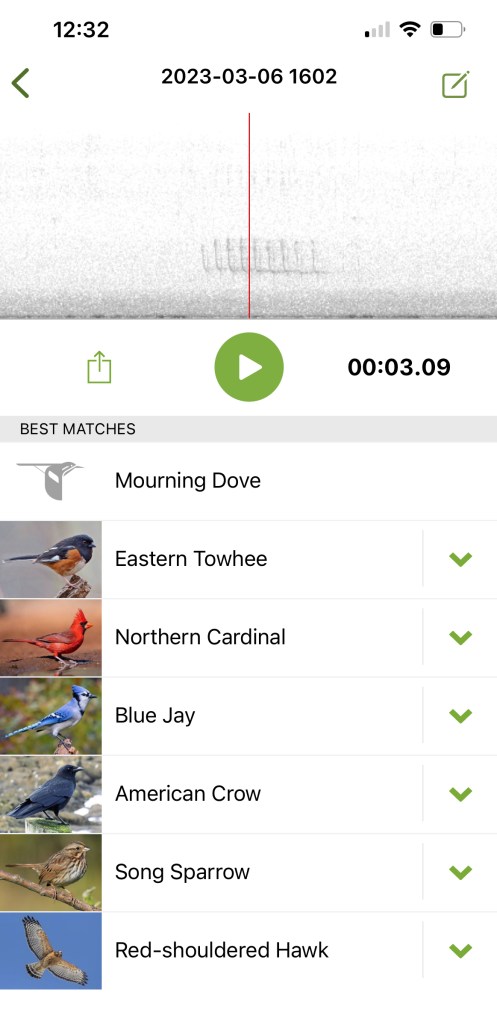 If you’re looking for birds and have a smartphone, it’s hard to improve on the free Merlin Bird ID app from the Cornell University Ornithology Lab. Not only does it help you identify birds through photos and location, but it also allows you to record bits of birdsong and identifies the birds you are hearing, and perhaps not seeing, by their various calls. The screenshot on the right shows a sample of a few seconds worth of audio bird identification.