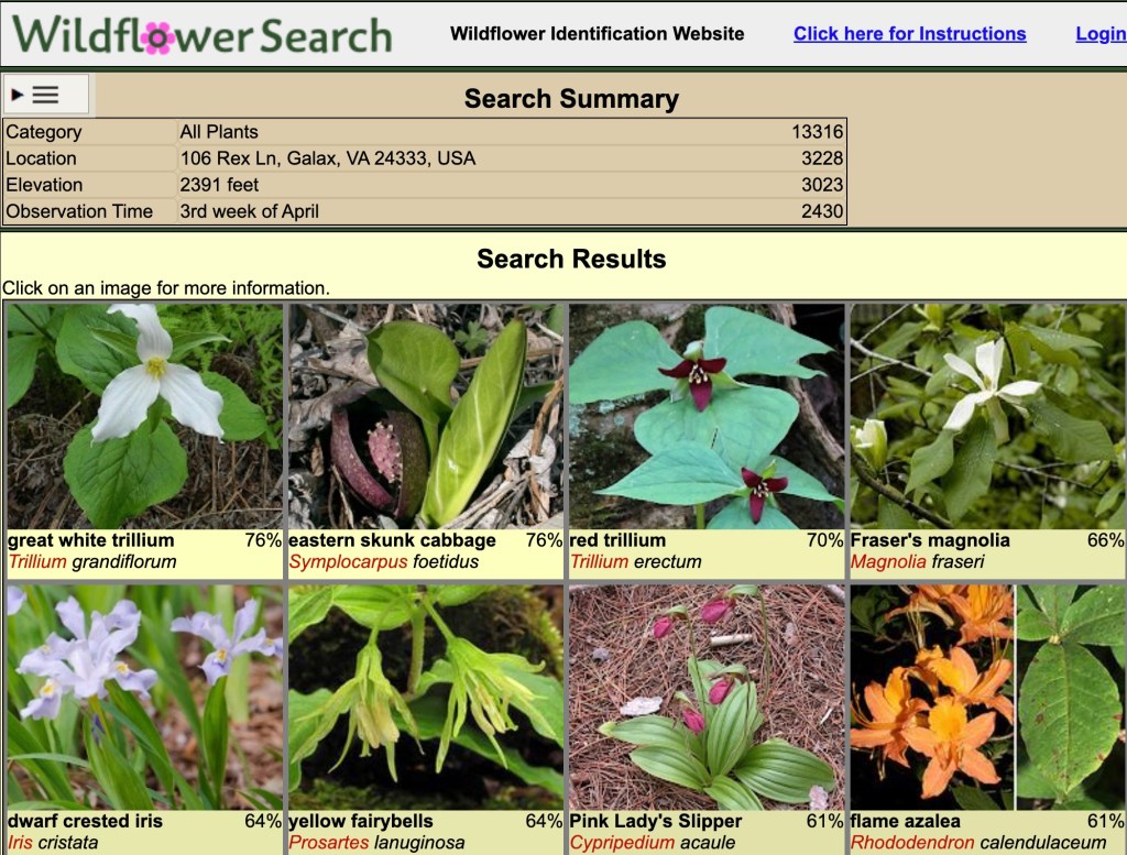 Besides the phone apps–which can be used in the field since they do not require an internet connection–the organization’s website allows you to search for plants throughout the United States and Canada from your laptop or desktop computer. Here, for example is a small portion of the results for Galax, Virginia during the third week of April: