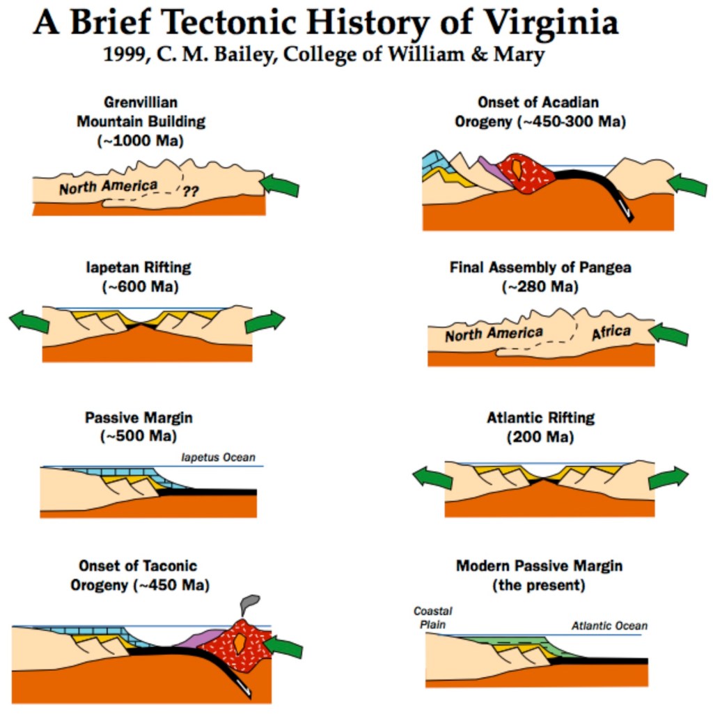 Like the rest of our planet, Virginia has been assembled and disassembled several times due to the forces of Plate Tectonics—numerous huge portions of the earth’s crust alternately crashing into one another and then splitting apart through a process called Orogeny.