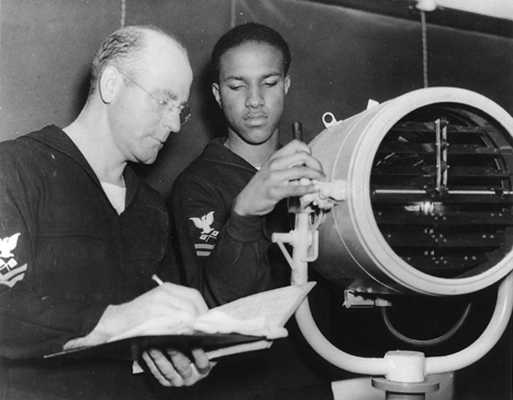 Flags would naturally be useless during nights, so signal lights were used instead to send messages via Morse code. The photo above is from a signal light training session.